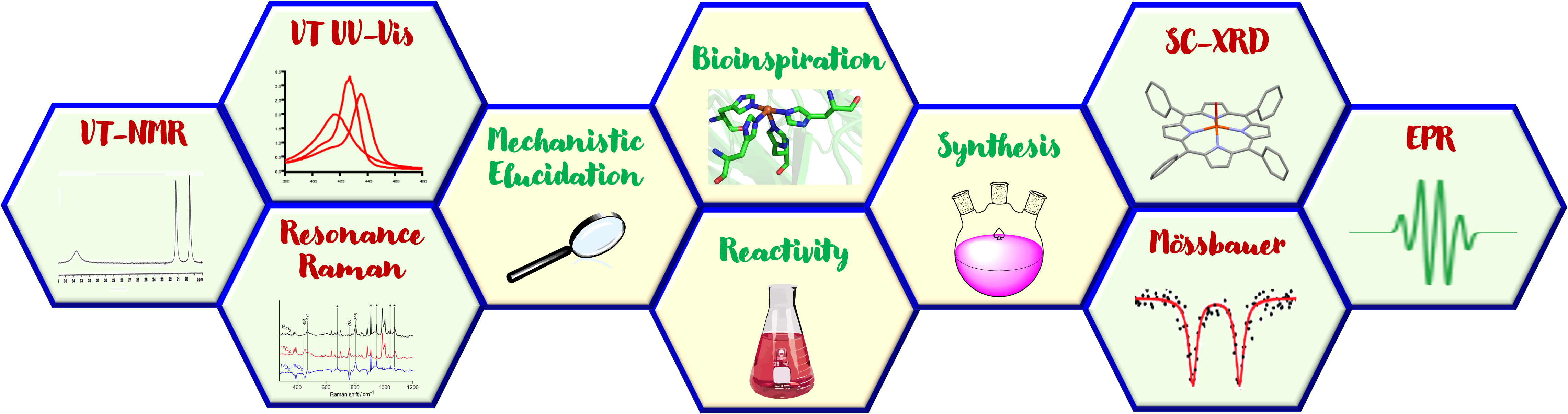 The basic theme of our research is to comprehend the yet unclear details pertaining to a number of crucial biological catalytic systems by utilizing suitable model compounds, and to interrogate how such comprehension may be sensibly applied to alleviate some of the paramount challenges we face today. Numerous examples exist where model systems have pioneered fruitful biochemical research in the absence of biological insights, exhibiting the remarkable potential of bioinspired model systems. Hence, we use the principles of synthetic organic, inorganic, and physical-inorganic chemistries to design new ligands and corresponding metal complexes that can provide as yet unknown reactivities, stabilize proposed intermediates, and address fundamental queries regarding structure-function relationships of various metalloenzymes. We use various spectroscopic methods (e.g. EPR, resonance Raman, Mössbauer, variable temperature UV-vis and NMR etc.) as part of our research program, and researchers will gain broad experience and achieve expertise across disciplines, with a foundation based upon inorganic chemistry, and extensions into organic and biological chemistries with industrial/medicinal/biotechnological application.